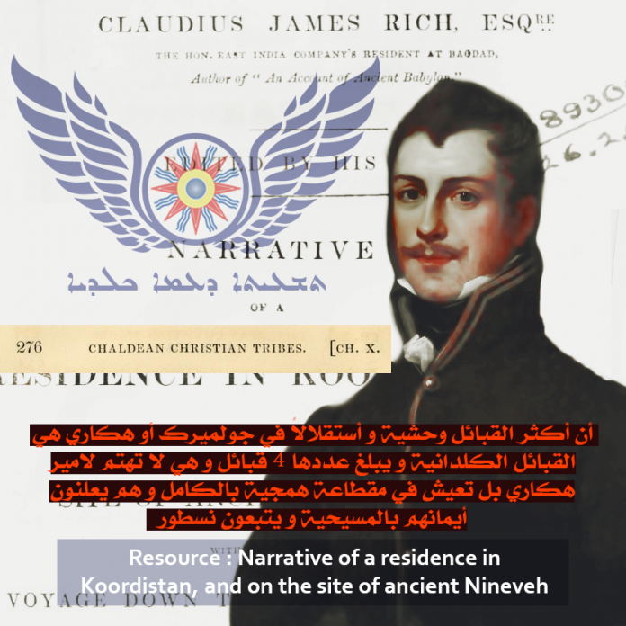 قام برحلة إلى شمال العراق الحالي و هكاري سنة 1820 حيث قابل النساطرة هناك و اقام بين قبائلهم و قد سجل مذكراته اثناء تلك الرحلة مفصلاً كل ما يتعلق بالنساطرة من أسس حياتهم و عيشهم و قد خصص كلوديوس في مذكراته فصلاً كاملاً عن نساطرة هكاري و شمال العراق بعنوان “” القبائل المسيحية الكلدانية “” و يكتب كلوديوس في الصفحة 276 من مذكراته : أن أكثر القبائل وحشية و أستقلالاً في جولميرك أو هكاري هي القبائل الكلدانية و يبلغ عددها 4 قبائل و هي لا تهتم لامير هكاري بل تعيش في مقطاعة همجية بالكامل و هم يعلنون أيمانهم بالمسيحية و يتبعون نسطور ( أي نساطرة ) .