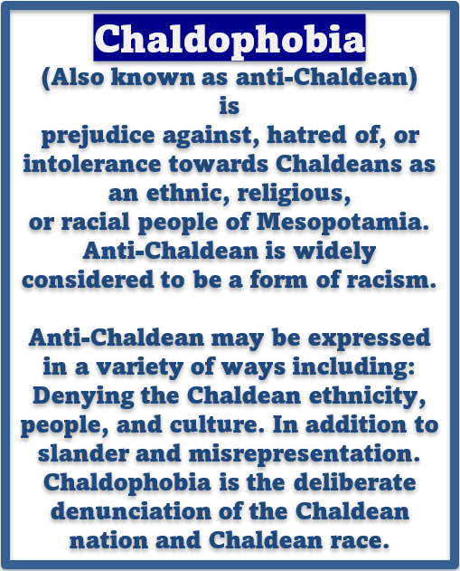 Denying the Chaldean ethnicity, people, and culture. In addition to slander and misrepresentation. Chaldophobia is the deliberate denunciation of the Chaldean nation and Chaldean race.