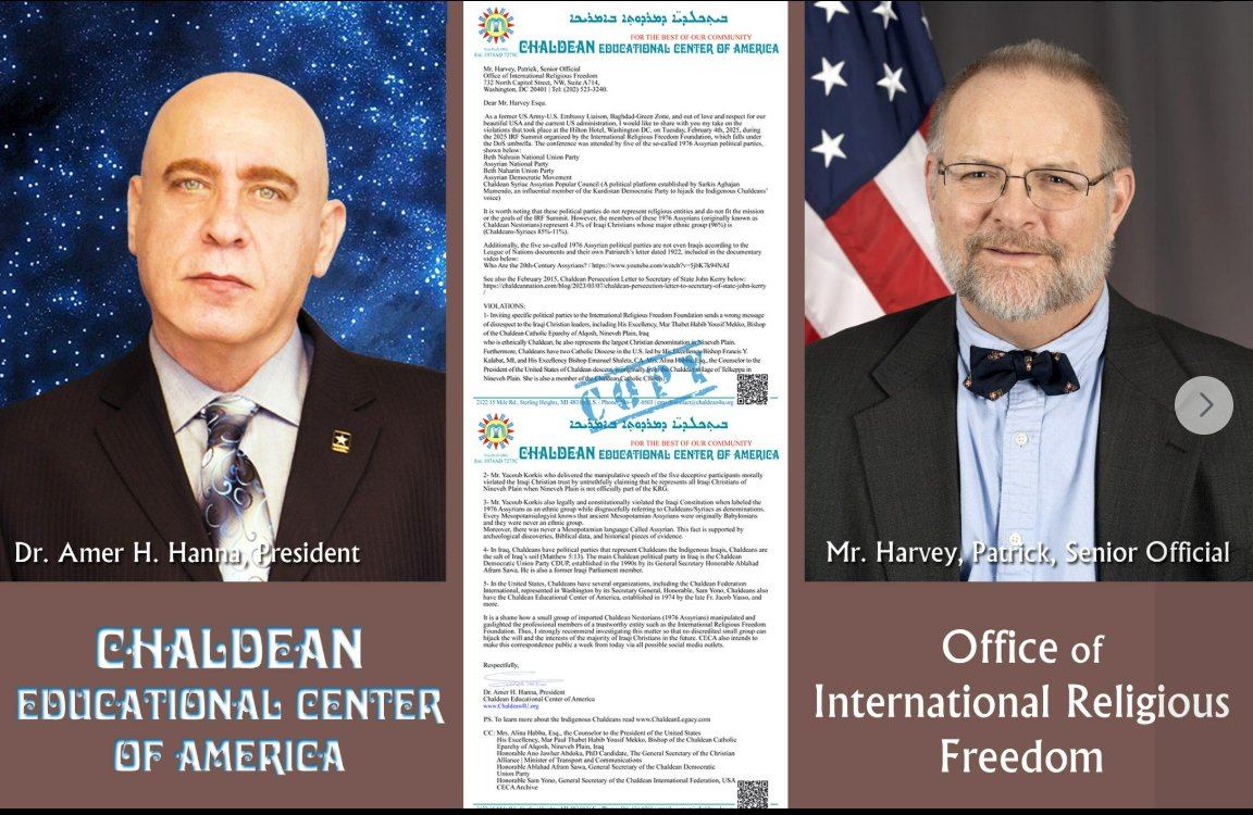 It is a shame how a small group of imported Chaldean Nestorians (1976 Assyrians) manipulated and gaslighted the professional members of a trustworthy entity such as the International Religious Freedom Foundation. Thus, I strongly recommend investigating this matter so that no discredited small group can hijack the will and the interests of the majority of Iraqi Christians in the future. CECA also intends to make this correspondence public a week from today via all possible social media outlets.