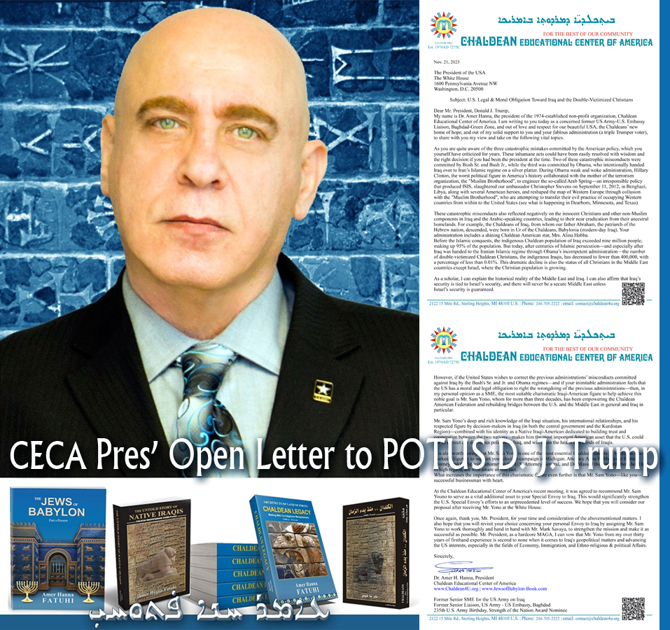 My name is Dr. Amer Hanna, the president of the 1974-established non-profit organization, Chaldean Educational Center of America. I am writing to you today as a concerned former US Army-U.S. Embassy Liaison, Baghdad-Green Zone, and out of love and respect for our beautiful USA, the Chaldeans’ new home of hope, and out of my solid support to you and your fabulous administration (a triple Trumper voter), to share with you my view and take on the following vital topics.